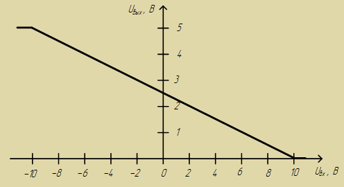 Необходимо преобразовать биполярный сигнал (-10 ÷ 10 В) в униполярный (0 ÷ 5 В). Для этого применена схема сдвига уровня и масштабирования. Передаточная функция такой схемы показана на рисунке 3.12.