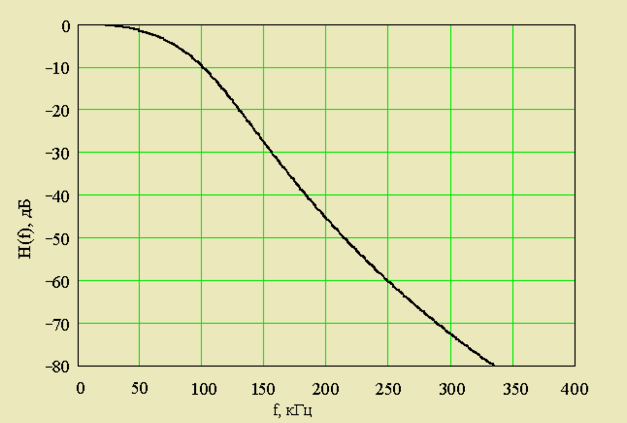 Частота дискретизации АЦП равна 420кГц. Максимальная верхняя частота, которой можно ограничить сигнал по теореме Найквиста равен 210 кГц. Но для того чтоб обеспечить ослабление в 74дБ на частоте 210 кГц, нужен порядок фильтра не менее 16. Большой порядок фильтра вызывается большое групповое время задержки. Поэтому для обеспечения полосы расфильтровки и небольшого порядка фильтра зададимся частотой среза ФНЧ 100 кГц. Значит, на ослабление в 74 дБ нужно обеспечить на частоте 300 кГц. Поэтому можно ограничиться 8-порядком фильтра.