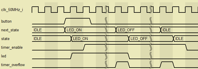 Сигнал timer_overflow , судя по названию, должен сигнализировать о том, что таймер отсчитал положенное ему время и переполнился. Логическая единица на линии timer_overflow обеспечивает переход из LED_ON в LED_OFF, а из LED_OFF в IDLE. Линия timer_overflow должна генерироваться таймером.